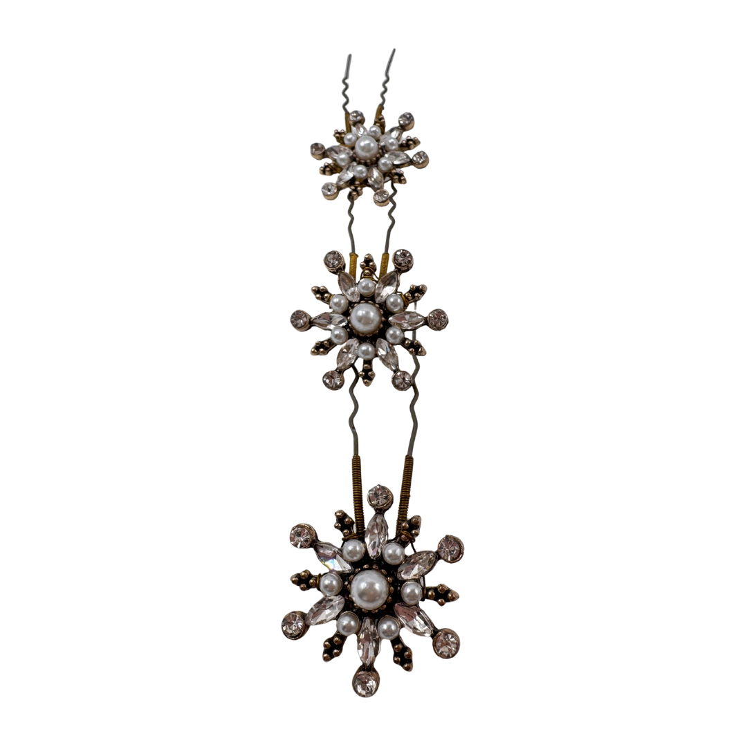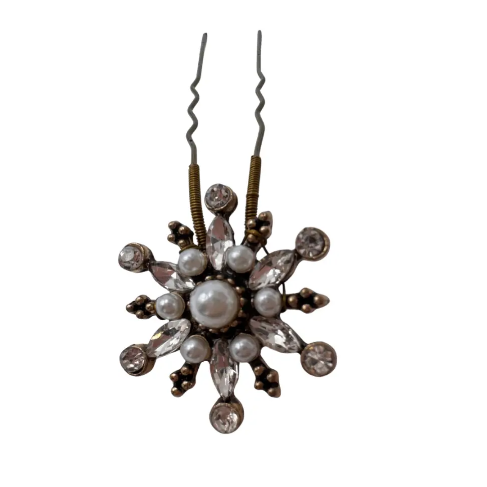 La Horquilla Novia Fabiola es una pieza delicada y sofisticada diseñada para realzar cualquier peinado con un toque elegante y luminoso. Su combinación de estrella en tono oro envejecido, cristal y perlas crea una estética refinada y atemporal.