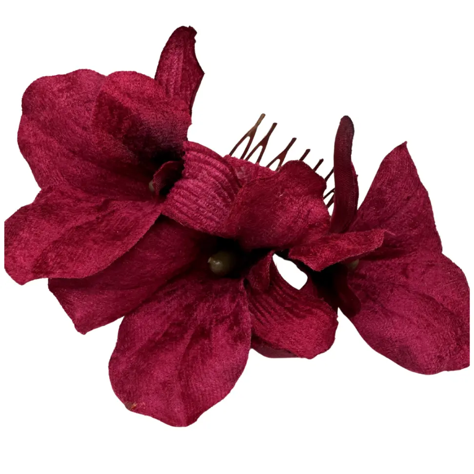 El Peinecillo Orquídeas Terciopelo Burdeos es ideal tanto para complementar trajes de flamenca como para looks de invitada, bodas, fiestas o celebraciones especiales donde quieras destacar con un detalle floral exclusivo.