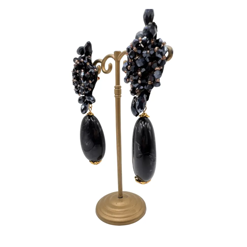Estos Pendiente Princesa Flor Negro Colección Jote Martínez 2026 están elaborados con una base de aplicación de pedrería cosida a mano en color negro translúcido, aportando brillo sutil y un acabado artesanal de gran calidad. Su diseño se completa con una lágrima en resina negra con efecto marmolado, que añade profundidad, estilo y sofisticación.
