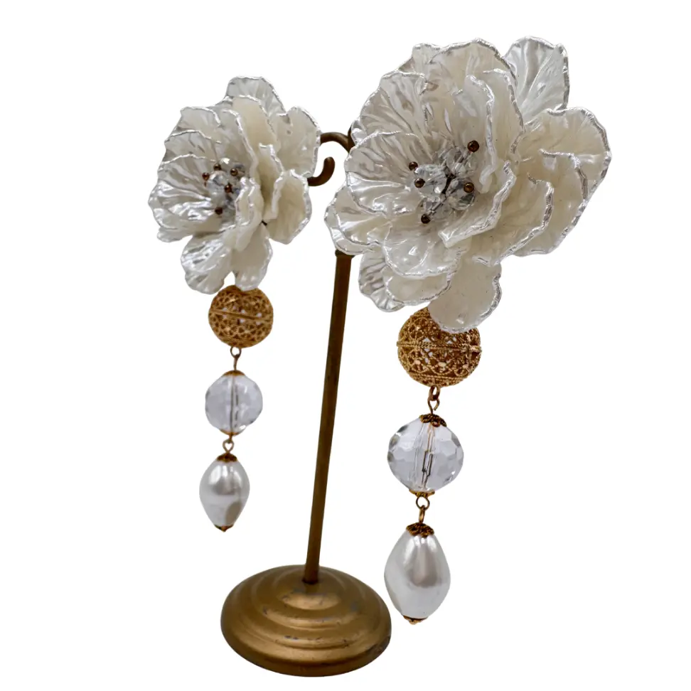 Los Pendientes Princesa Flor Blanco Colección Jote Martínez 2026 destacan por su elegante diseño floral artesanal con pedrería, pistilos de cristal checo y lágrima de perla de río. Un complemento sofisticado y versátil, ideal para flamenca, invitada o fiesta.