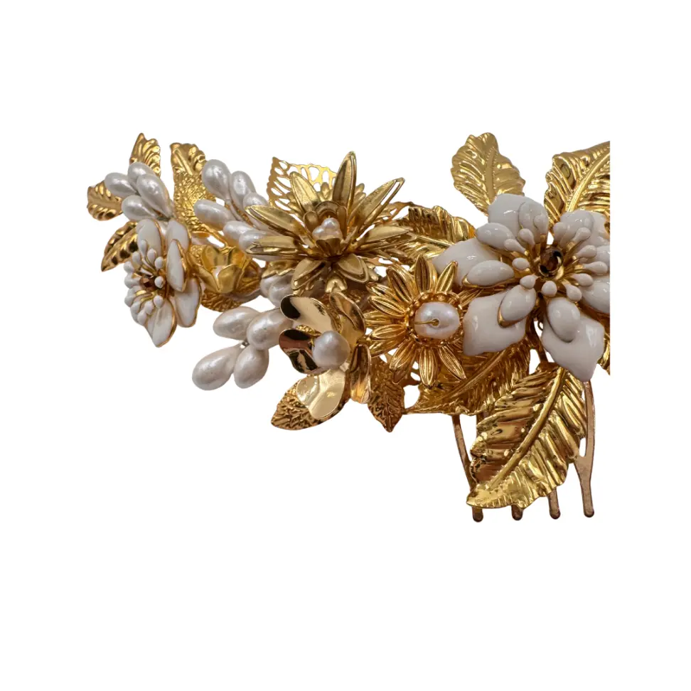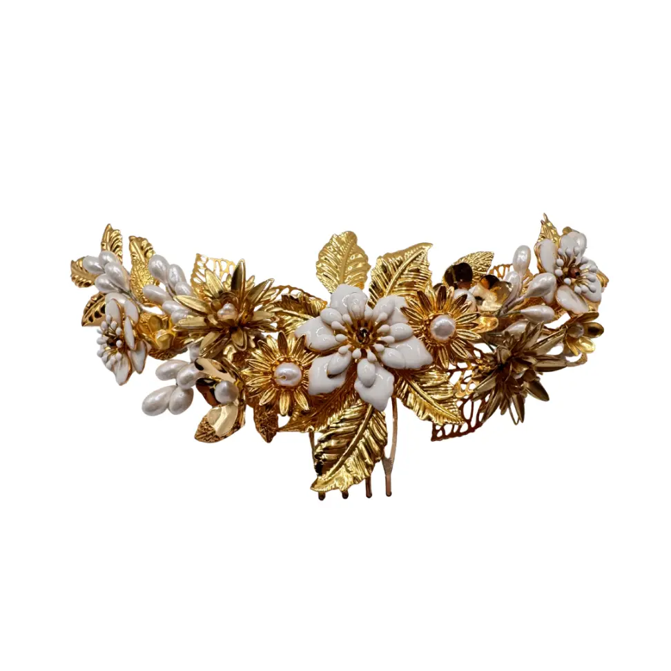 Este Tocado Joya Carmen está elaborado con delicadas piezas metálicas cuidadosamente ensambladas, acompañadas de perlas de río naturales, cristal checo y flores blancas esmaltadas que aportan brillo, romanticismo y sofisticación.