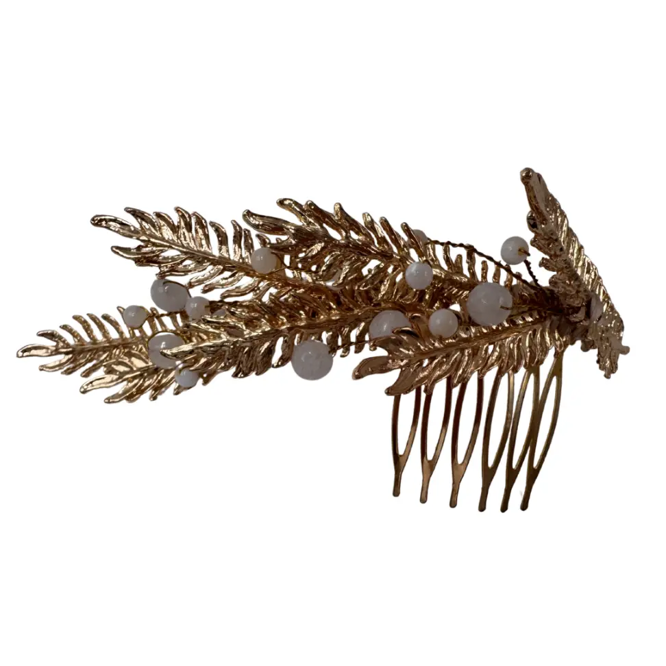 El Tocado Joya María es un accesorio sofisticado pensado para mujeres que desean aportar elegancia a su look con un estilo discreto pero especial. Su combinación de colores dorados y blanco crea una estética luminosa, delicada y muy favorecedora.